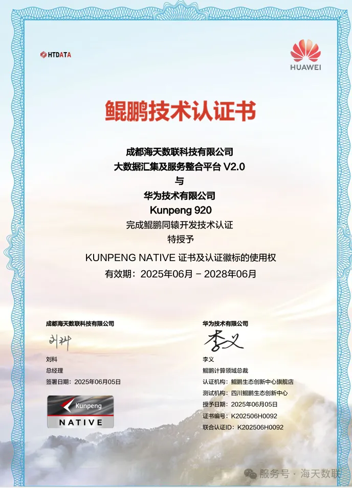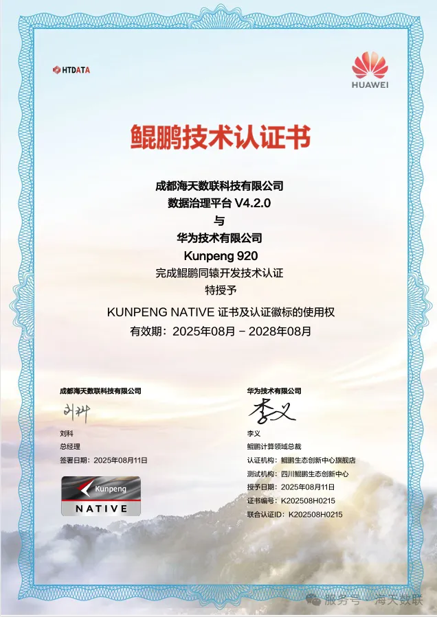 在數字化(hua)轉(zhuan)型與國產化(hua)替代(dai)加速推進的(de)(de)背(bei)景(jing)下(xia),基(ji)于鯤鵬架構的(de)(de)自(zi)主(zhu)可控計算生(sheng)態已(yi)成為國家(jia)數字基(ji)礎(chu)設施建(jian)設的(de)(de)核心支撐。“KUNPENG NATIVE” 認(ren)證(zheng)(zheng)作為鯤鵬生(sheng)態最深(shen)層次的(de)(de)技(ji)術認(ren)證(zheng)(zheng),絕非簡單(dan)的(de)(de)兼容性(xing)測試,而是(shi)對軟(ruan)件產品(pin) “深(shen)度(du)適配(pei)、性(xing)能最優、架構協同” 的(de)(de)嚴苛(ke)檢驗。海天(tian)數聯的(de)(de)數據(ju)產品(pin)能夠(gou)通(tong)過這一(yi)認(ren)證(zheng)(zheng),背(bei)后是(shi)研發團(tuan)隊(dui)在國產大(da)數據(ju)基(ji)礎(chu)軟(ruan)件自(zi)主(zhu)創(chuang)新(xin)的(de)(de)持(chi)續(xu)技(ji)術攻堅。