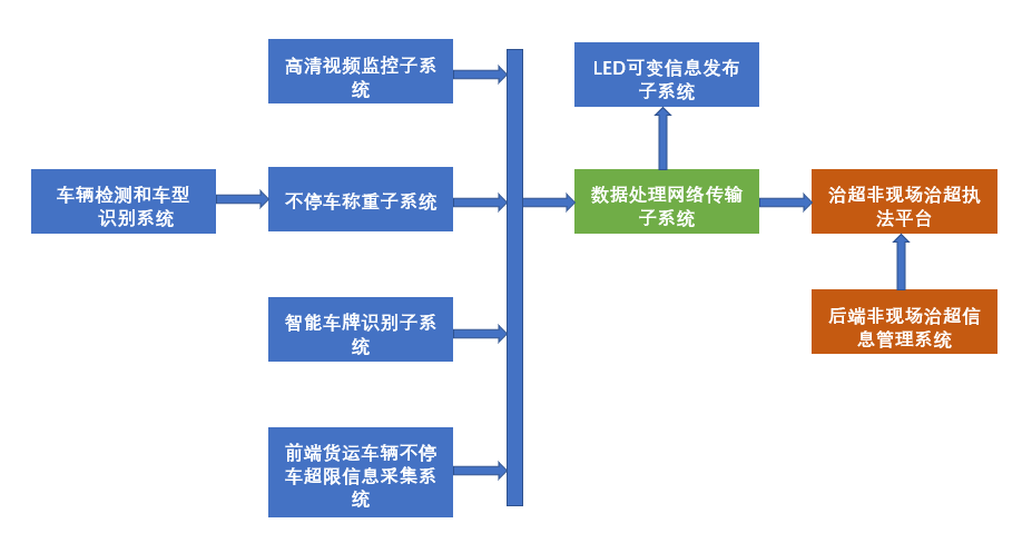 非現場執法的治超系統是將不停車動態稱重、視頻監控、圖像抓拍及車牌識別、信息提示系統的有機集成,建立起一個全天候貨運車輛超載違法行為監控系統。非現場執法的治超系統由前端貨運車輛超限信息采集系統、車牌識別子系統、不停車稱重子系統、視頻監控子系統、數據傳輸子系統、信息發布子系統和后端超限信息管理與非現場執法平臺組成。對貨運車輛超載行為實施有效檢測和監控,為交通管理部門提供治超執法依據。