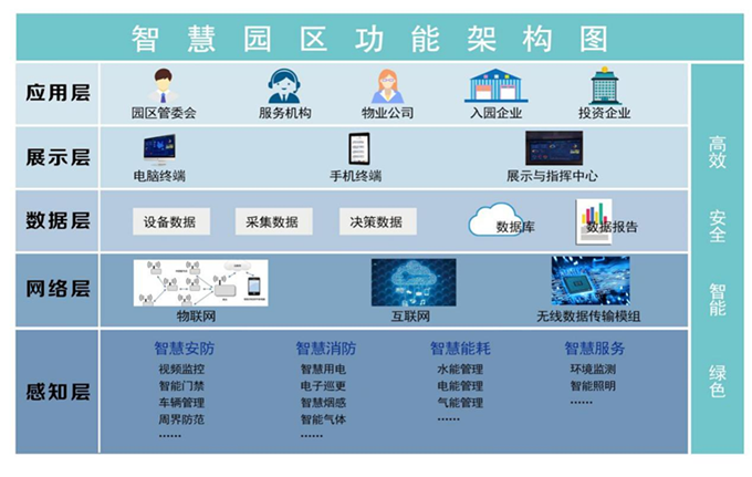 項目位于四川天府新區興隆湖科學城核心區域,東至興隆148號路,西至梓州大道,占地面積約151.6畝,總建筑面積約50萬平方米,其中地上總建筑面積約35.6萬平方米。建設項目涉及范圍:綜合布線、監控系統、光纖入戶及無線網絡、信息發布、機房工程、離線巡更系統、停車場系統、電梯五方通話系統、智能家居系統、電子圍欄、充電樁、背景音樂、可視對講門禁系統、智能照明。智慧園區總體框架以“信息基礎設施集約建設、信息資源共享利用”為原則,充分利用云計算、物聯網、大數據、移動互聯、新一代通訊網絡等先進技術,采用面向服務的SOA架構設計,按照分層構架、模塊化設計,包括感知層、網絡層、數據層、平臺層、應用層。感知層包括對事物信息的感知、對人機交互信息的感知和對信息傳遞的感知,感知層是獲取信息的來源。網絡層將感知來的信息通過通信網、互聯網、物聯網等各種網絡傳遞至數據層、展示層進行信息的處理和展顯,最后在應用層上提供園區各領域的應用。
