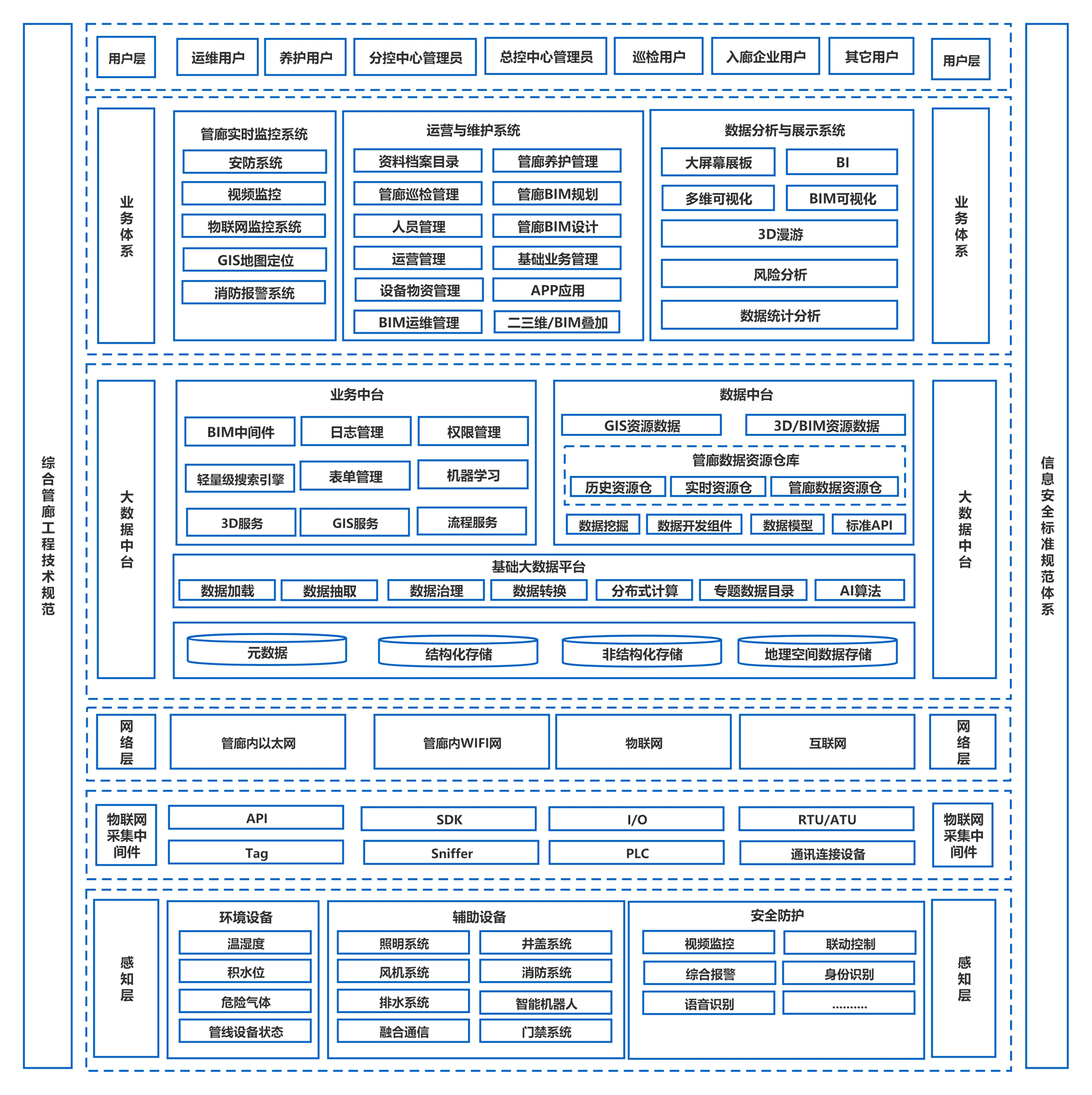 地下綜合管廊是指在城市地下建造一個隧道空間,將電力、通訊、燃氣、供熱、給排水等各種工程管線集于一體,實施統一規劃、建設,以形成一種集約化、可持續性的管線敷設方式,是韌性城市建設的重要組成部分。地下綜合管廊包含多種智能化系統,其結構復雜,需要統一的集成管理,通過建設地下綜合管廊管理平臺實現各系統統一管理、信息共享及聯動控制。根據國標《城市綜合管廊工程技術規范》(GB50838)要求,建設地理信息系統和統一管控平臺,綜合管廊的建設應向智慧化方向發展,通過結合BIM、物聯網、大數據技術,建設智慧管控一張圖,智慧運營服務、智慧應急、大數據分析等系統平臺,覆蓋綜合管廊項目全生命周期,實現綜合管廊規劃、建設、運行、維護及管理、服務的智慧化,保障綜合管廊全生命周期的安全、高效、智能、綠色,從而提升城市基礎設施功能和城市運行能力。