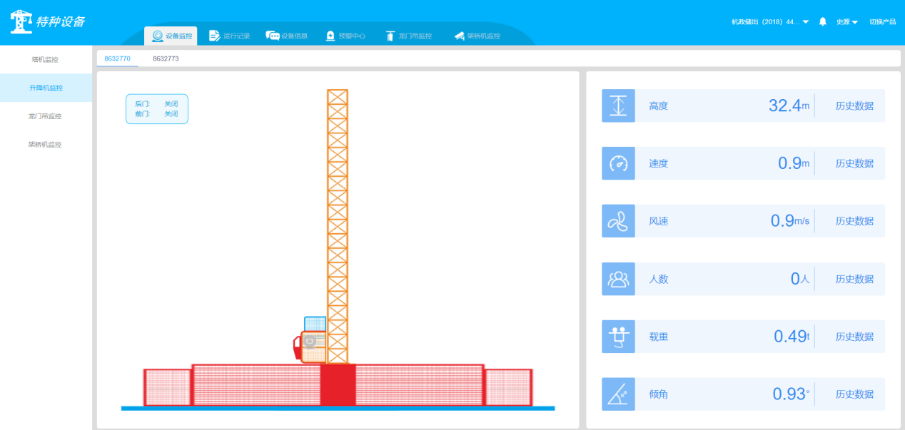 接入工地現場升降機監控系統,實時監控塔機運行參數,包括定位數據、司機身份、吊籠人數、門鎖狀態、高度、樓層、載重、傾角等,能升降機工作過程出現異常情況時進行實時預警,并進行制動控制。對升降機工作狀態實時記錄,方便事故追本溯源。