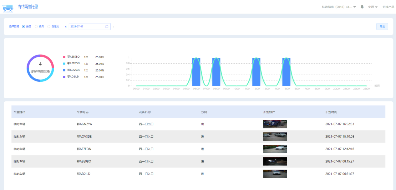 接入工地現場車輛出入口車牌識別系統,對進出車輛進行在線管理,包括車輛進出記錄功能、白名單管理功能、場內車輛統計功能等。