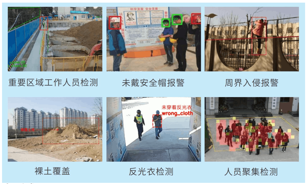 接入工地現場視頻監控系統,對工地施工過程中的情況進行可視化監控,同時對環境、特種設備、出入口、工程車輛、人員等內容進行綜合視頻監管。視頻監控應具備實時顯示、視頻控制、視頻分析、錄像回放、設備管理、權限管理、聯動報警等功能。
