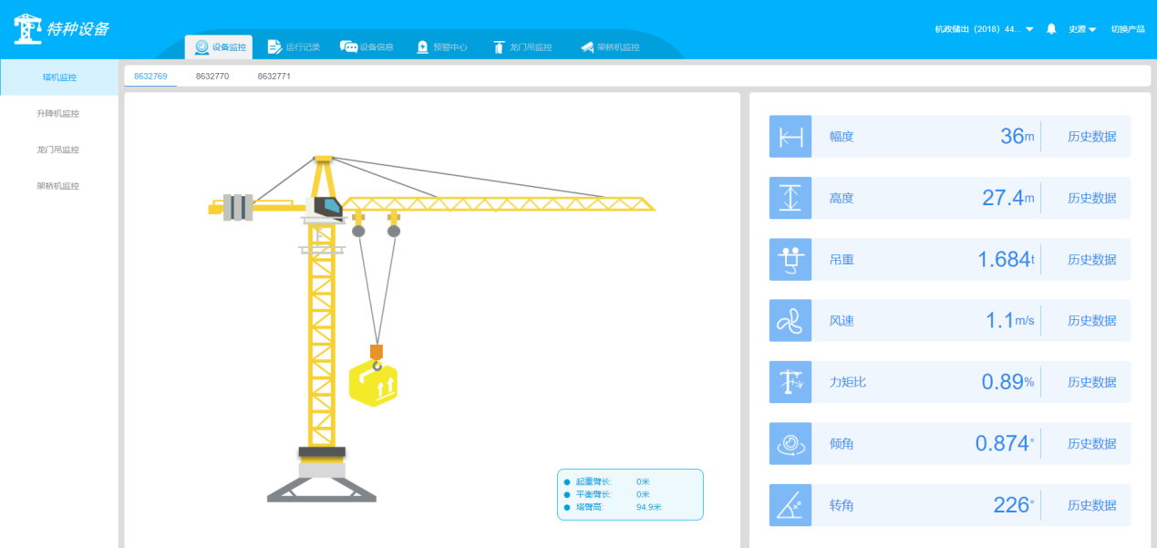接入工地現場塔機監控系統,實時監控塔機運行參數,包括定位數據、幅度、高度、回轉、載重、傾角、風速風向等,能夠對塔機工作過程進行實時預警,并進行制動控制。對塔機工作狀態實時記錄,方便事故追本溯源。