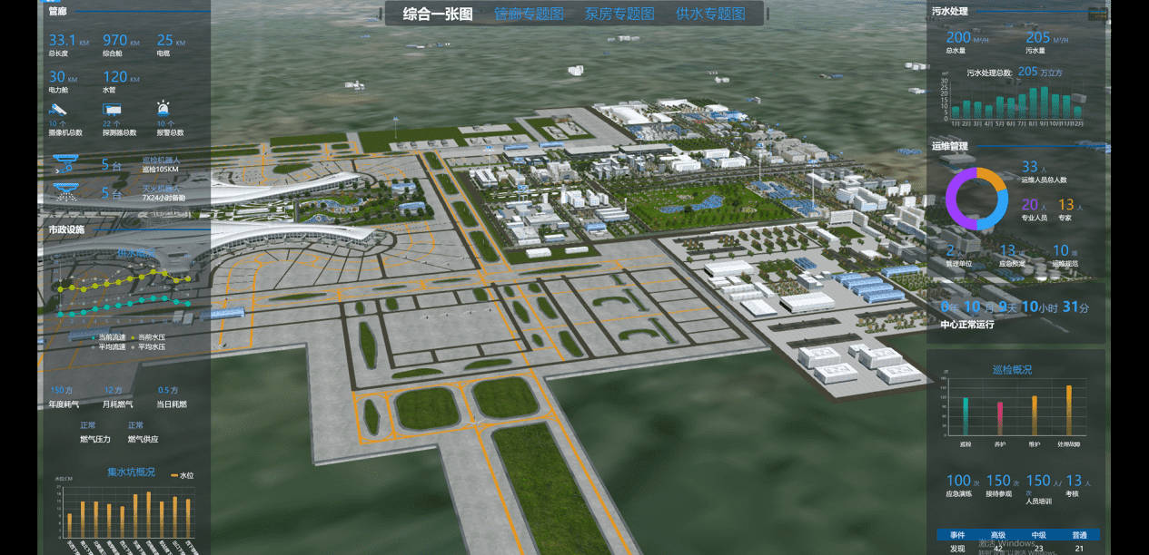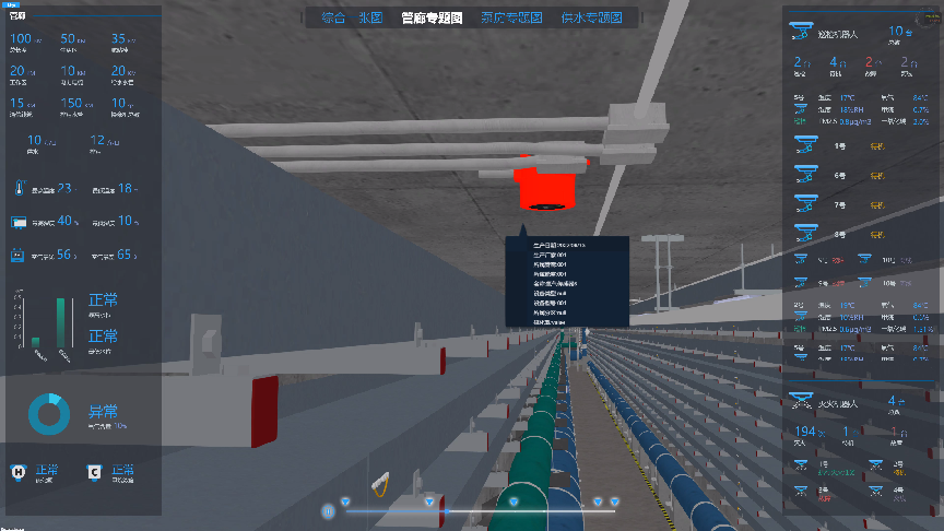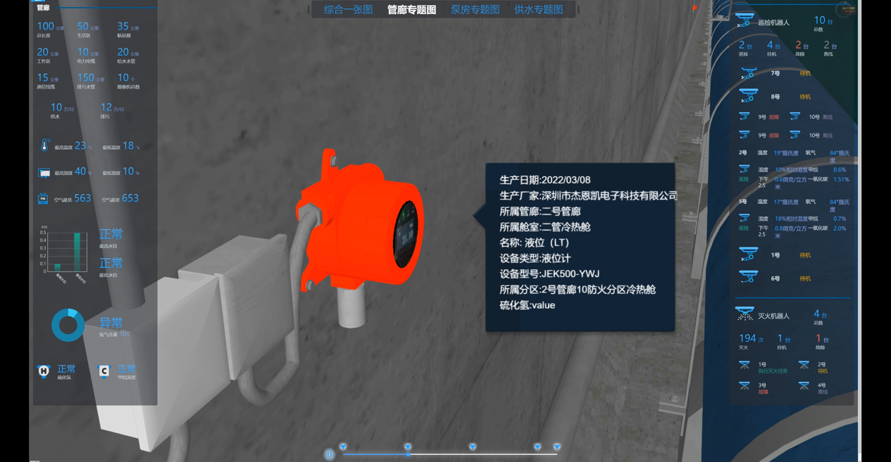 管(guan)廊采用數(shu)字(zi)(zi)孿(luan)生(sheng)技術(shu)完成數(shu)據(ju)處理(li)的(de)數(shu)字(zi)(zi)化、虛擬(ni)化,通(tong)過建模將現(xian)(xian)實場(chang)景轉(zhuan)換成數(shu)字(zi)(zi)模擬(ni)場(chang)景,高精度模擬(ni)現(xian)(xian)實世界。接入疊加各類物聯網設備(bei)產生(sheng)的(de)監(jian)(jian)控(kong)數(shu)據(ju)及其空間位置,對現(xian)(xian)實環境進行(xing)多方位監(jian)(jian)控(kong),在三維數(shu)字(zi)(zi)孿(luan)生(sheng)虛擬(ni)現(xian)(xian)實的(de)基礎(chu)上疊加數(shu)據(ju)統(tong)計展板,直觀呈現(xian)(xian)多維度數(shu)據(ju),有效協助管(guan)理(li)單(dan)位和單(dan)位領導分析、規劃、決策、風險預估等。