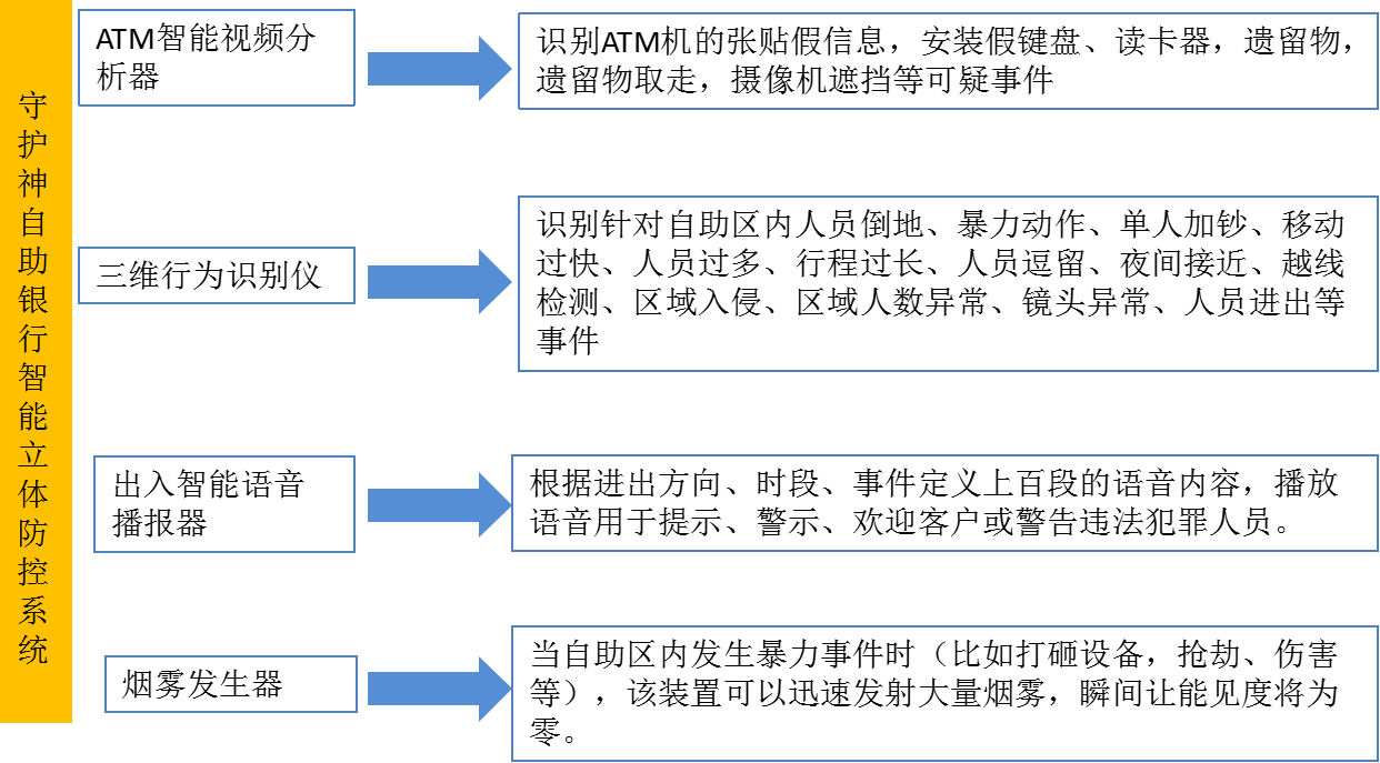 通過三維行為識別儀、ATM智能視頻分析器、出入智能語音播放器、煙霧發生器構成自主銀行立體化的防控體系。