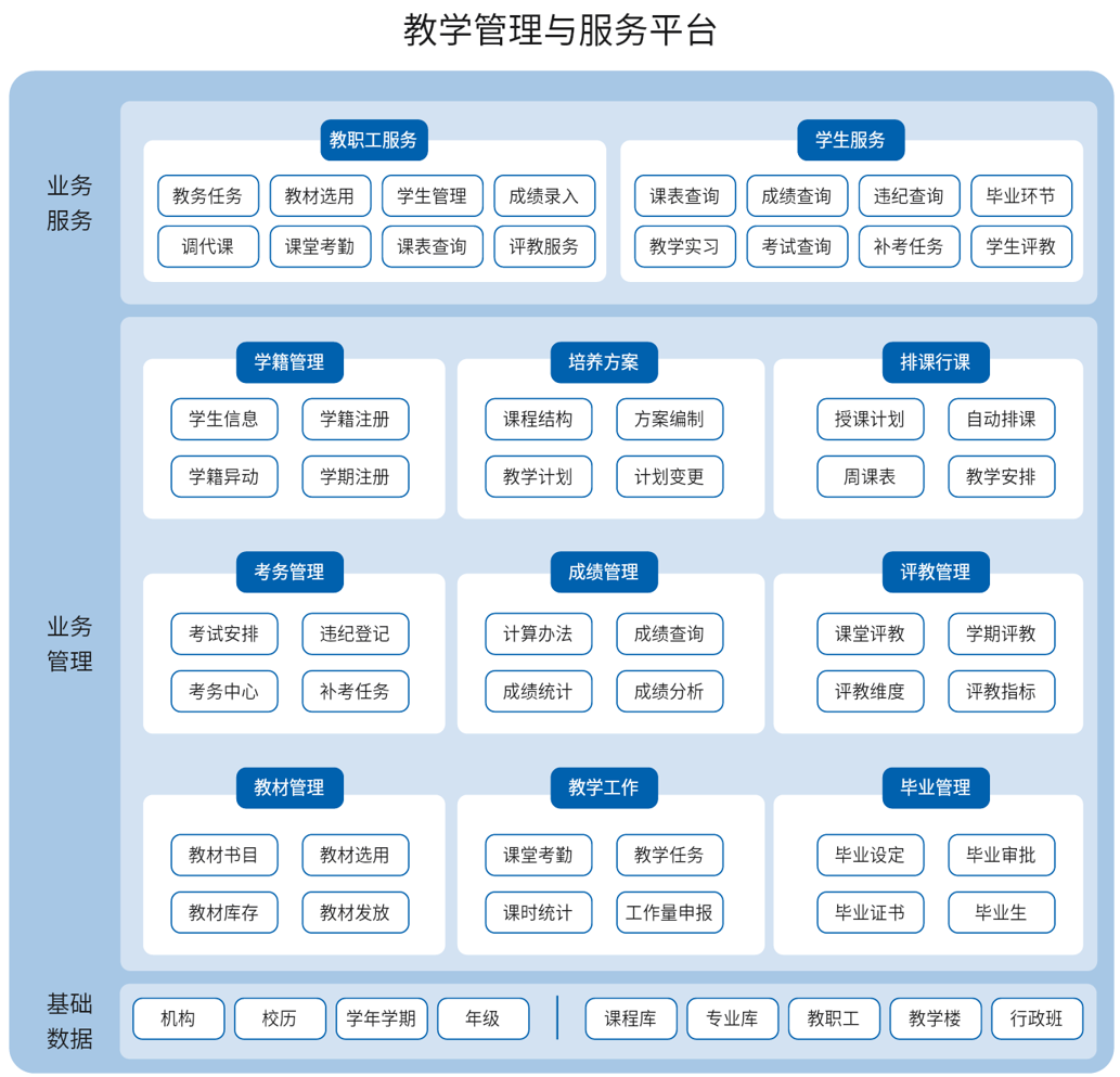 在政策層面,國家《教育信息化“十三五”規劃》及《教育信息化2.0行動計劃》明確要求推動教務管理從電子化向智能化轉型,構建“互聯網+教育”平臺,實現數據互通與教學場景融合。在業務層面上,教育信息化在政策強力驅動下進入高速發展期,“教務系統”作為學校智慧校園建設的核心載體,其需求從基礎管理(排課、成績錄入)轉向智能決策支持(如學業預警、教學質量評估)轉變等;其系統本身設計與迭代需深度契合國家戰略導向與行業變革需求。