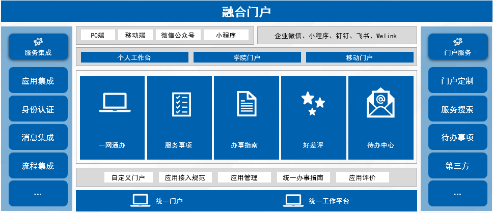 融合門戶是學校入口統一、部門協同、數據互通、一網辦理、高效便捷的智慧校園一體化服務平臺,支撐線下窗口服務大廳、線上網上辦事大廳、移動客戶端、自助終端等多種形式相結合、相統一的校務服務體系。推動實現以統一身份認證系統為基礎的“一號”互通,以智慧校園一體化服務平臺為支撐的“一站”受理,以校務服務管理平臺、為支撐的“一網”通辦。實現互聯網和校務服務深度融合,全面提升校務服務事項從受理、審批到辦結全流程網上辦結率。構建跨校區、跨層級的一體化校務服務體系,大幅提升各級部門單位服務智慧化水平,讓校務服務更聰明,讓學生、教職工和社會公眾辦事更方便、更快捷、更有效率。